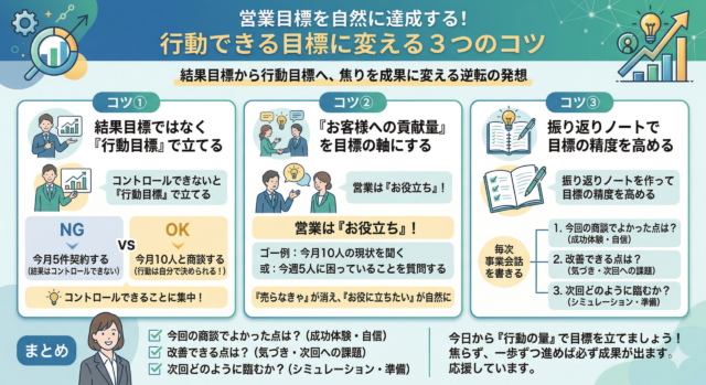「今月5件の契約を取る」ではなく、「今月10人のお客様と商談する」というように設定します。契約の件数はコントロールできませんが、商談の回数は自分でコントロールできます。コントロールできることを目標にすると、毎日何をすればよいかが明確になります。